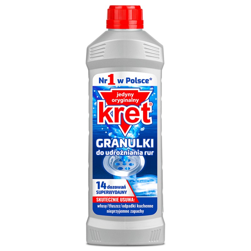 Najchętniej wybierany przez Polaków środek do udrażniania kanalizacji. Oryginalny KRET do RUR w postaci rozpuszczalnych granulek. Bezwzględny dla zatorów w rurach i syfonach, w kuchni i łazience. Natychmiastowo przywraca drożność instalacji w domu. Skutecznie usuwa nieprzyjemne zapachy z odpływów. Opakowanie 560 g na 14 dozowań.
