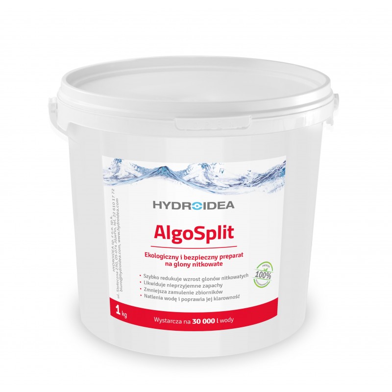 AlgoSplit to preparat w granulkach, bazujący na nadtlenku wodoru, który po zetknięciu z wodą rozkłada się na wodę i tlen. Natychmiastowe uwolnienie aktywnego tlenu niszczy strukturę komórkową glonów. Martwe glony nitkowate wypychane są do powierzchni lustra wody, przez co są łatwe do usunięcia np. za pomocą siatki (podbieraka). Pozostałe resztki glonów zbierają się w filtrach lub opadają na dno zbiornika, gdzie rozkładane są przez bakterie saprofityczne.
