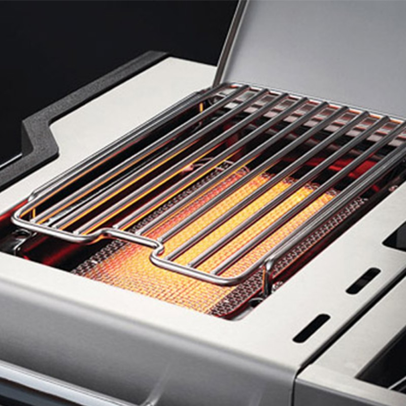 Wyposażony w cztery główne palniki, boczny palnik Sizzle Zone™ na podczerwień oraz tylny palnik do rożna, grill ten oferuje wszystko, czego potrzebujesz do przygotowywania wykwintnych potraw w swoim ogrodzie – od kiełbasek, po burgery, karkówkę, kurczaka z rożna czy pyszne warzywa i sałatki.
