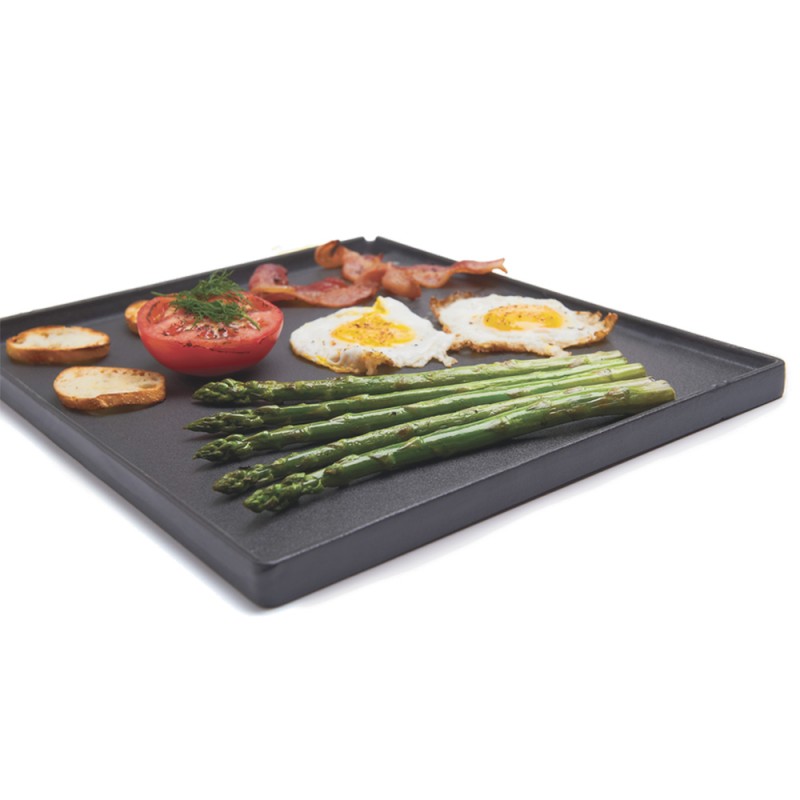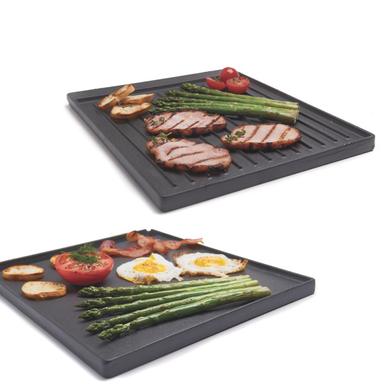 Dwustronna, solidna płyta wykonana z żeliwa to doskonały pomysł na przygotowanie dodatkowych dań na Twoim grillu. Ryflowana strona płyty znajdzie zastosowanie w przygotowaniu warzyw, owoców, małych kawałków mięsa oraz owoców morza. Na płaskiej stronie z łatwością przygotujesz sadzone jajka, naleśniki, czy bekon.