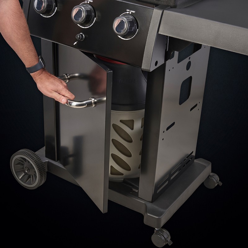 O pojemności 11 kg pozwala na schludne przechowywanie butli i zabezpiecza ją przed uszkodzeniami. Jednoskrzydłowe drzwi pokryte proszkowo lakierem ułatwiają dostęp do butli propan-butan i dodają estetyki całemu grillowi.