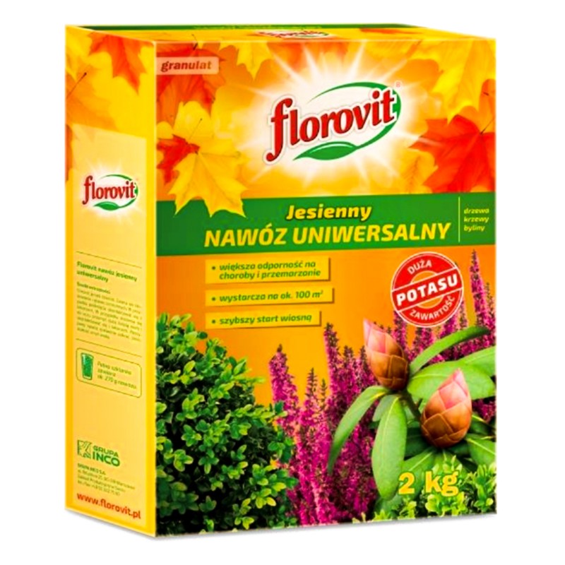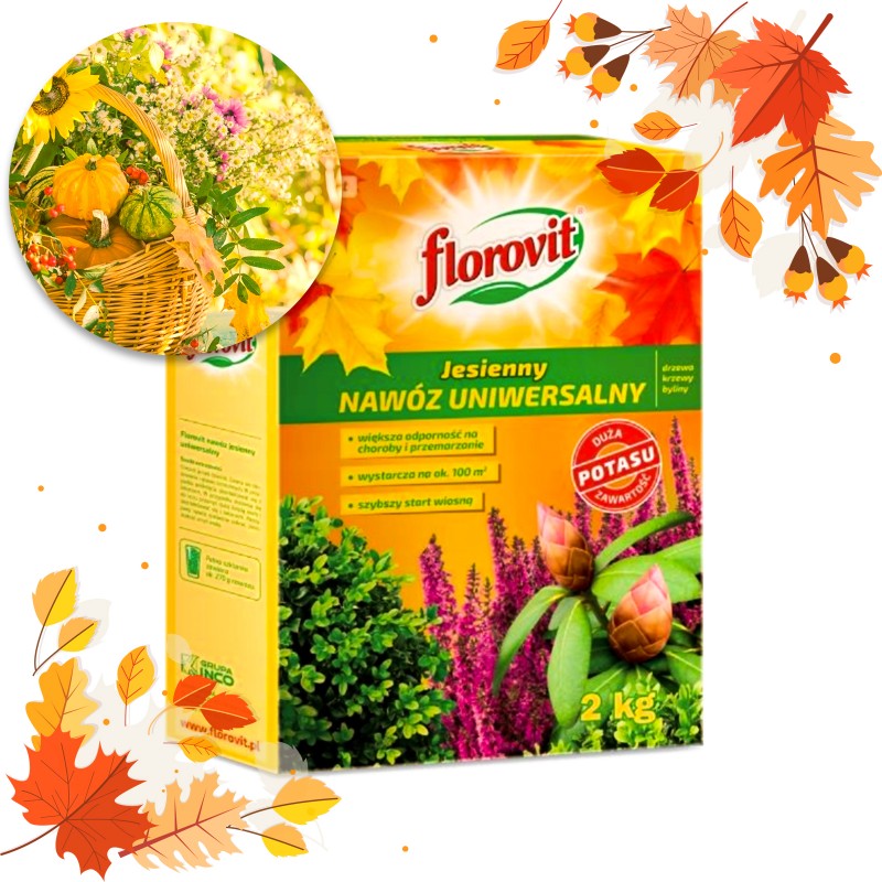 Kompletny, granulowany nawóz jesienny Florovit do zimowania roślin wieloletnich (bylin), drzew, krzewów i roślin cebulkowych. Nawóz uniwersalny bogaty w potas i mikroelementy - chroni przed przemarzaniem i chorobami.