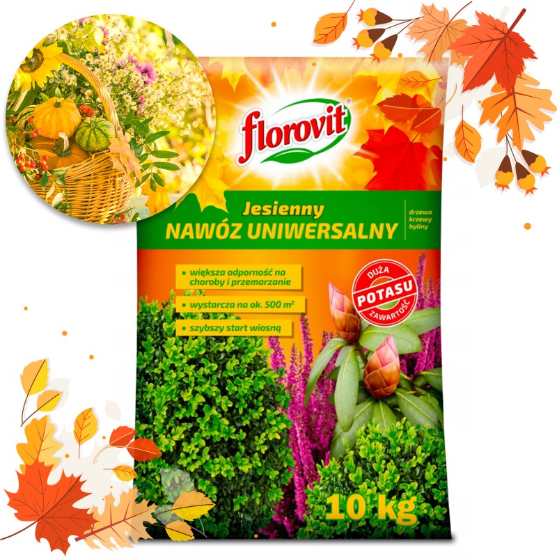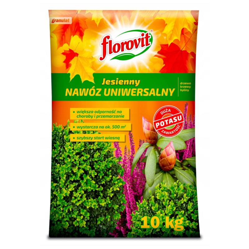 Kompletny, granulowany nawóz jesienny Florovit do zimowania roślin wieloletnich (bylin), drzew, krzewów i roślin cebulkowych. Nawóz uniwersalny bogaty w potas i mikroelementy - chroni przed przemarzaniem i chorobami.