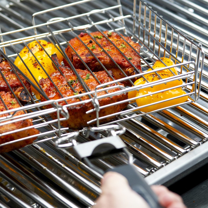 Dzięki sprytnemu mechanizmowi zamykającemu na specjalny zamek, możesz bez obaw obracać cały kosz, mając pewność, że zawartość pozostanie bezpiecznie w środku. To idealne rozwiązanie do grillowania delikatnych warzyw, krewetek, pokrojonych owoców czy małych kiełbasek.