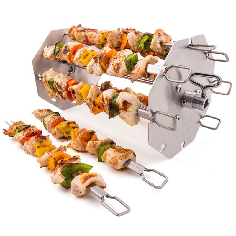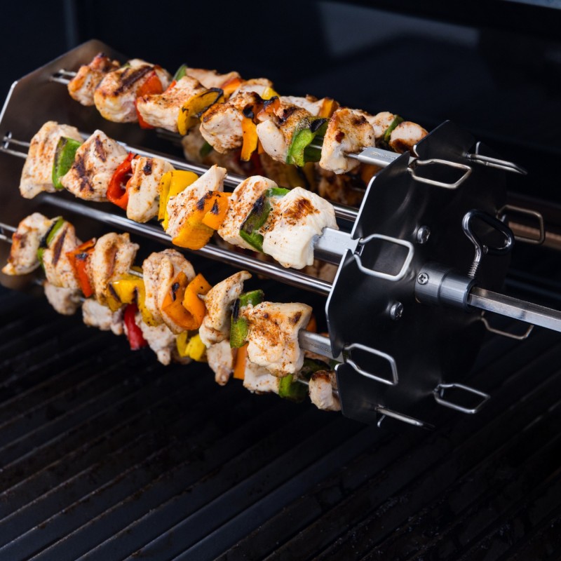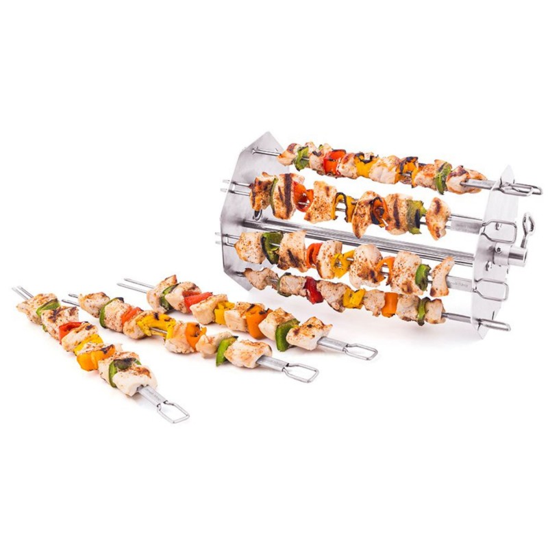 Specjalnie zaprojektowane szpikulce montowane są na obracającym się pręcie rożna, co eliminuje konieczność ręcznego obracania potraw. Dzięki temu każda porcja mięsa, warzyw czy owoców jest idealnie wypieczona z każdej strony. Obrotowa blokada zapewnia stabilność i bezpieczeństwo podczas grillowania nawet przy pełnym obciążeniu.