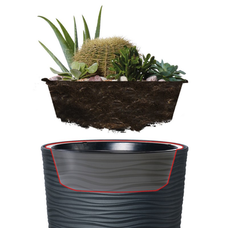 Dzięki falistej strukturze powierzchni pojemnik zmienia barwę w zależności od kąta padania promieni słonecznych, a ZINTEGROWANA DONICA o głębokości 20 cm daje szerokie możliwości aranżacji roślinnej na zbiorniku w ogrodzie.