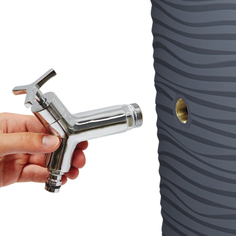 Dzięki dwóm metalowym przyłączom mosiężnym (³/₄″) można zamontować kranik lub podłączyć uniwersalny zestaw węży. Przed zimą łatwo opróżnić pojemnik przez dodatkowe przyłącze spustowe.