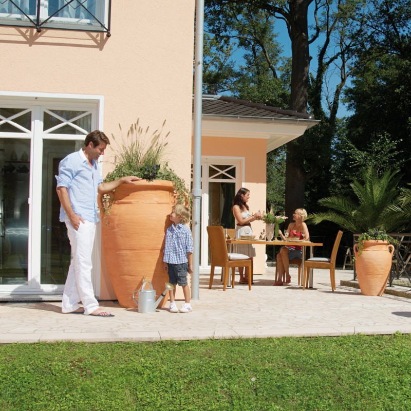Piękna amfora magazynuje i zbiera deszczówkę spływającą z dachu naszego domu. Garantia do deszczówki to doskonałe połączenie zbiornika na wodę deszczową z estetyką dekoracji ogrodowej.