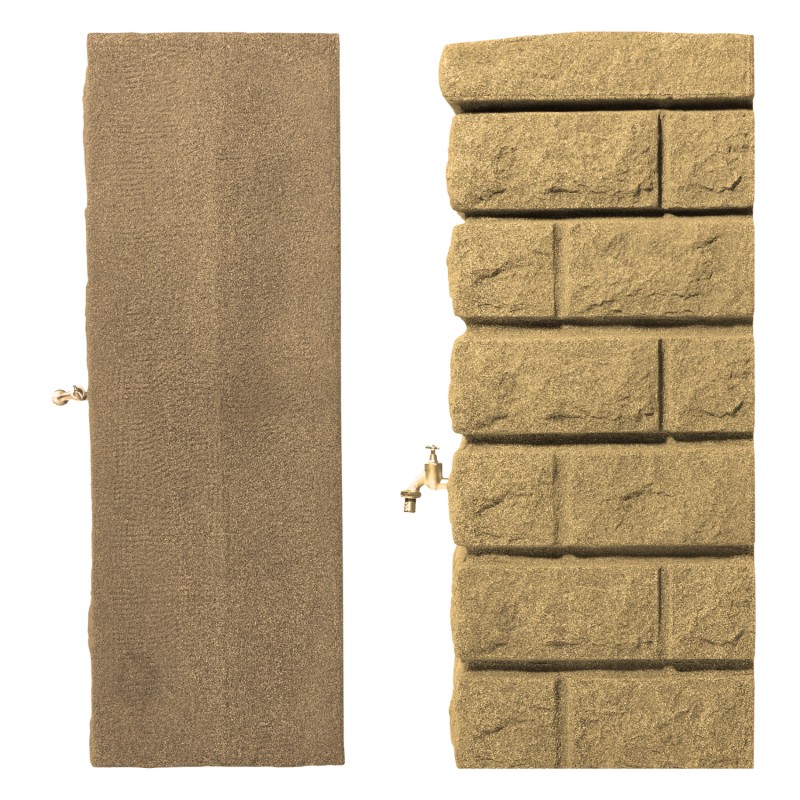 Zbiornik ROCKY 400L Piaskowy to przyścienny pojemnik na wodę deszczową o fakturze naturalnego kamienia. Dzięki specjalnemu procesowi produkcji każdy egzemplarz jest unikalny.