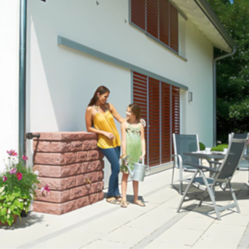 Zbiornik przyścienny ROCKY zbiera wodę deszczową spływającą z rynien. Można go podłączyć za pomocą łapacza deszczu (do kupienia osobno), który kieruje nadmiar wody do zbiornika podczas opadów.