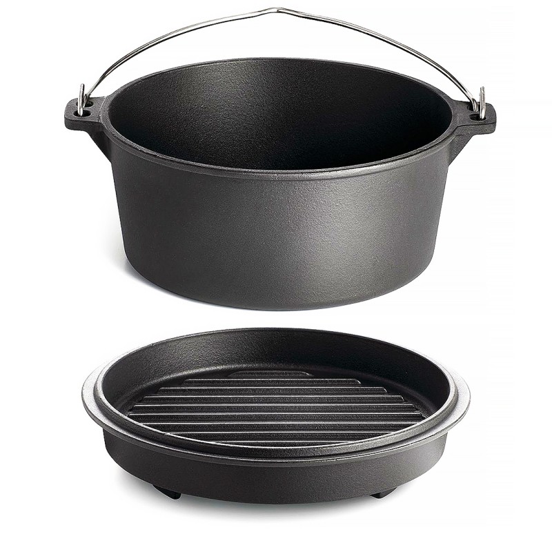 Dodatkowo, w zestawie znajduje się specjalna pokrywka z uchwytem i trzema nóżkami. Dzięki temu, pokrywka może służyć nie tylko do przykrywania kociołka, ale także jako samodzielna żeliwna patelnia (lub ruszt), którą można odwrócić i używać bezpośrednio na grillu lub w palenisku.
