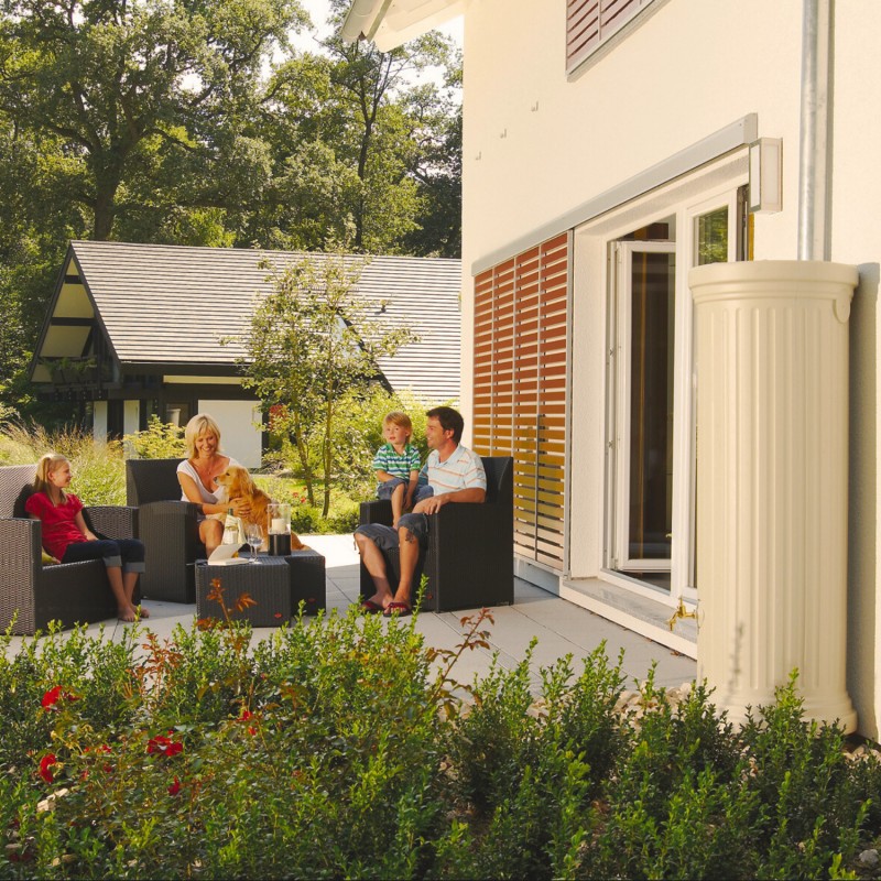 Zbiornik Garantia Column w kolorze piaskowym doskonale komponuje się z naturalnymi elementami ogrodu i subtelnie wtapia się w otoczenie.