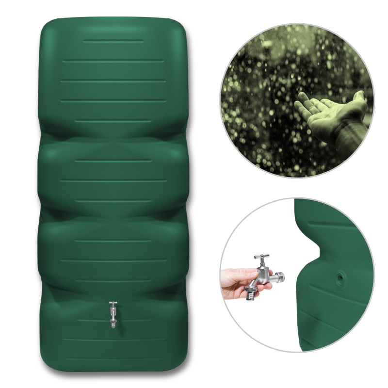 Dekoracyjny zbiornik deszczowy Aqua tower o pojemności 350L. Pojemnik ozdobny wykonany w modernistycznym stylu. Doskonale sprawdzi się jako zbiornik przyścienny. Aż 4 przyłącza gwintowane 3/4" dla mocowania podłączy zewnętrznych. Wloty górne do pozyskiwania wody opadowej z rynien. Zbiornik z pokrywą. Pojemnik z mocnego i wytrzymałego na zimno i UV HDPE.