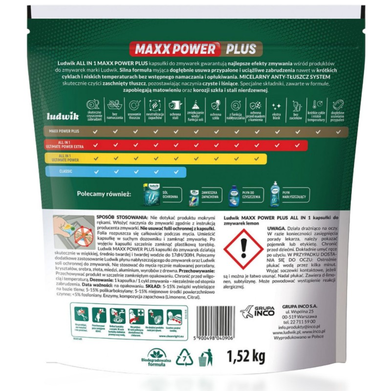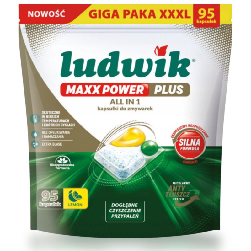 Szukasz kapsułek, które zapewnią lśniąco czyste naczynia bez szorowania, namaczania i smug? Ludwik Maxx Power All-in-1 to kompletne rozwiązanie do codziennego mycia naczyń w zmywarce.