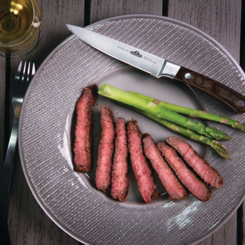 Rękojeść z drewna palisandru nie tylko pięknie wygląda, ale też zapewnia pewny i wygodny chwyt, nawet podczas długiego biesiadowania przy grillu. Pełnowymiarowy trzpień ze stali nierdzewnej gwarantuje doskonałe wyważenie, dzięki czemu ruchy nożem są płynne i bezwysiłkowe. To narzędzie, które równie dobrze prezentuje się na stole, jak i radzi sobie w kuchennym boju.