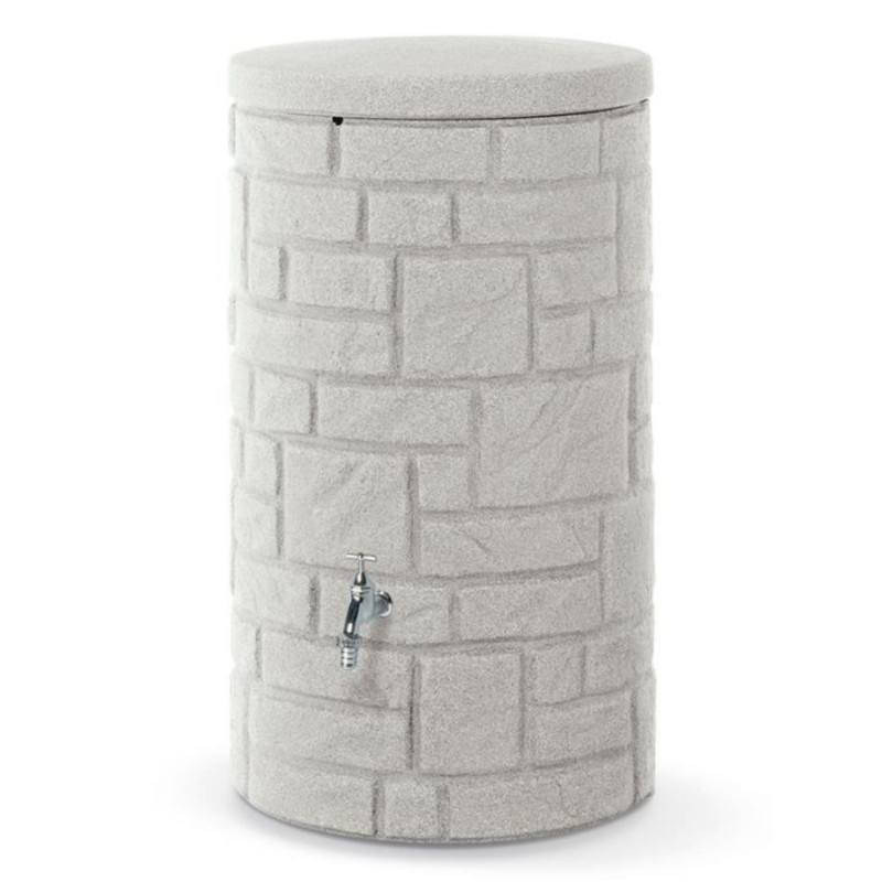 Dekoracyjny zbiornik deszczowy Maurano o pojemności 300L. Element dekoracyjny imitujący szary kamień. Aż 2 przyłącza i gwint 3/4" na kranik z przodu. Zbiornik z pokrywą i donicą na rośliny ozdobne.. Pojemnik z mocnego polietylenu.