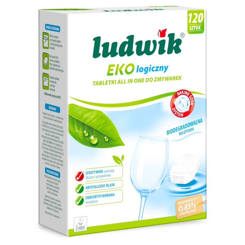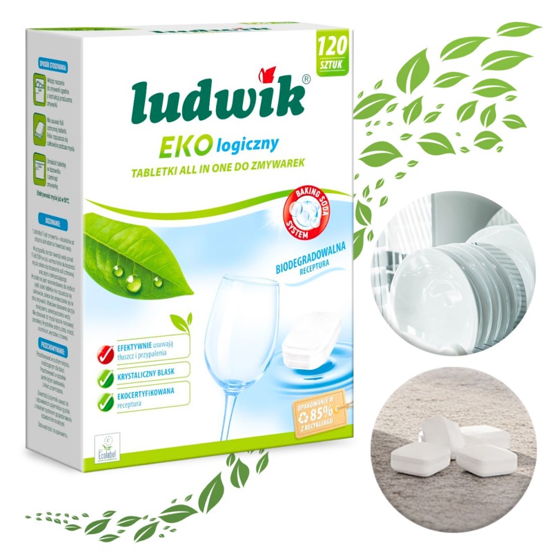 LUDWIK Ekologiczne Tabletki do zmywarki, wielofunkcyjne. Wysoka skuteczność zmywania. skuteczne usuwanie tłuszczu i przypaleń.Metoda Baking Soda, działanie aktywnym tlenem oraz enzymami. Przyjazne dla szamb i oczyszczalni. Opakowanie: 50 sztuk.