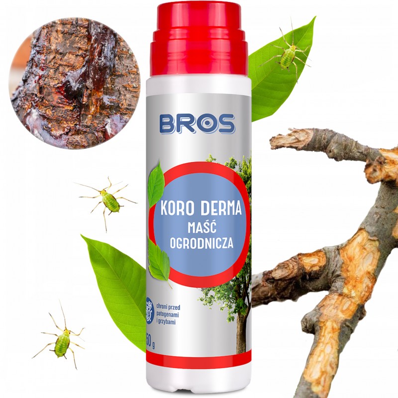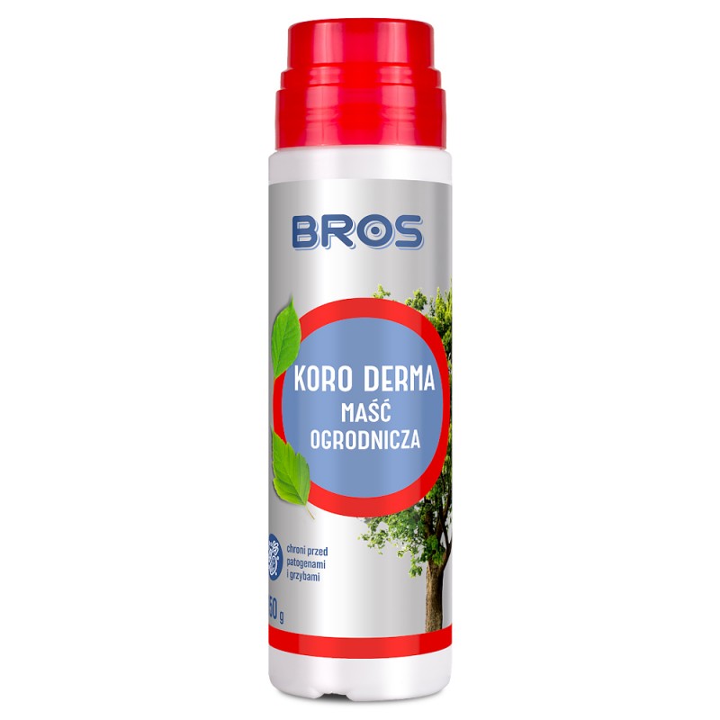 BROS Koro Derma maść ogrodnicza to specjalistyczny preparat (z aplikatorem) do zabezpieczania ran na drzewach i krzewach powstałych w wyniku szczepień, uszkodzeń mechanicznych, pęknięć po mrozie oraz szkód wyrządzonych przez zwierzęta.