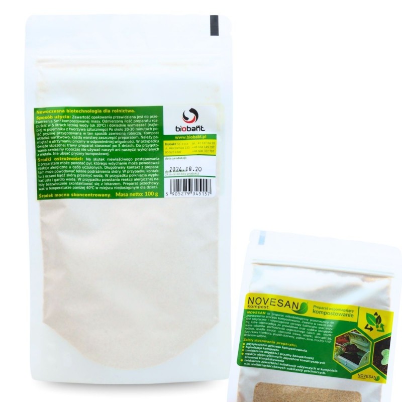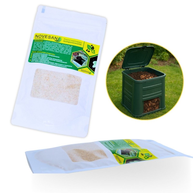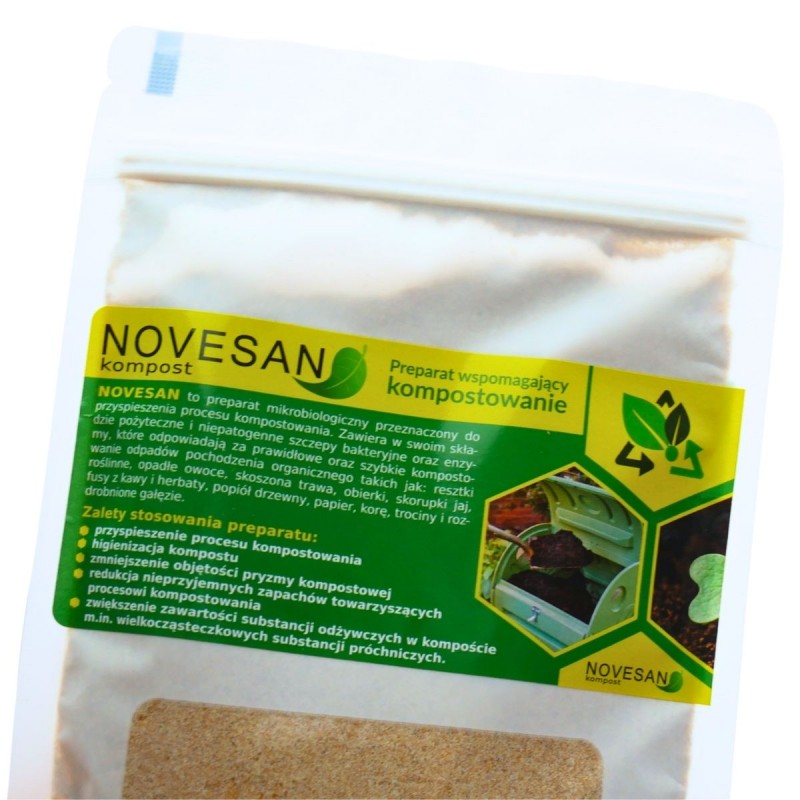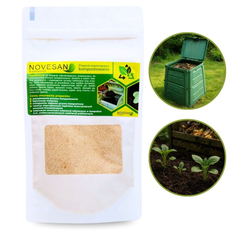Novesan Kompost 100 g to mikrobiologiczny preparat, który przyspiesza naturalny proces rozkładu odpadów organicznych w kompostowniku.