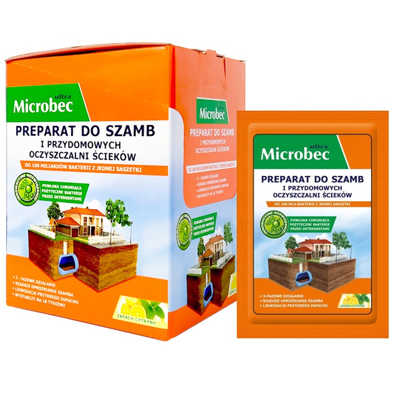 Microbec to preparat do biodegradacji zawartości szamba. Systematyczne stosowanie Microbec'u zmniejsza częstotliwość opróżniania szamba, usuwa nieprzyjemny zapach i udrażnia system instalacji sanitarnej. Musująca formuła o świeżym zapachu cytryny ułatwia rozrzedzanie się preparatu w zbiorniku.Wystarczy wsypać odpowiednią ilość do toalety i spłukać.